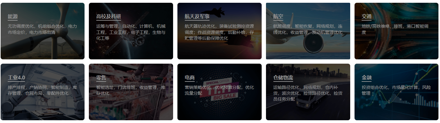 COPT线性及整数求解器已被应用于国家和企业的多个重要项目中,拥有丰富的落地场景。并可针对不同行业解决方案定制化,根据需求及实际情况,为客户量身定制服务。